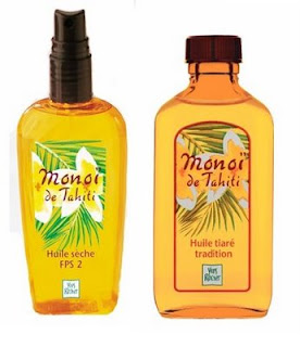 Actualmente existen varias lineas de bronceadores de Monoï (y a base de Monoï, que no hay que confundir). Estos protectores solares estás hechos del mismo modo, le extraen la flor una vez macerado el aceite e incorporan el filtro solar: por esa razón, la flor no está dentro. Tienen una concentración del 50% de Monoï.